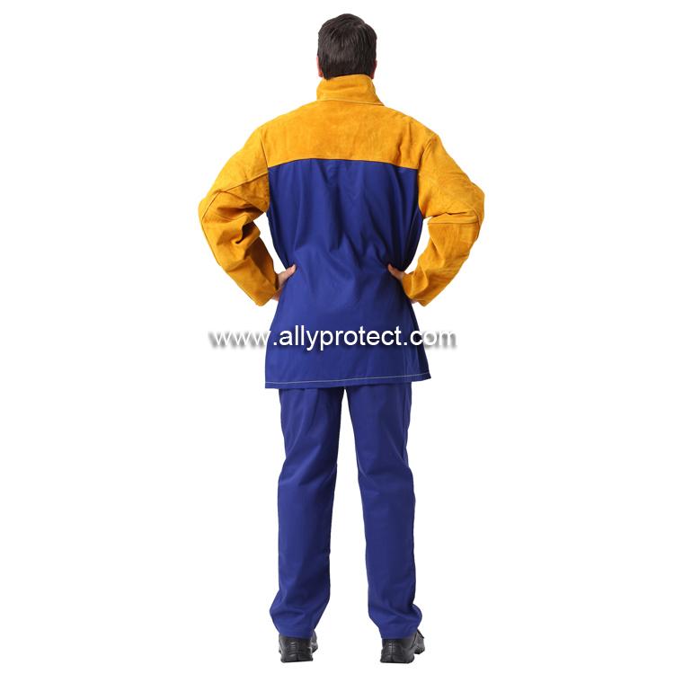 - 產(chǎn)品描述: [ AP ]前幅和衣袖采用金黃色牛二層皮,后幅采用藍(lán)色防護(hù)阻燃布,專為焊工在炎熱環(huán)境下工作而設(shè)計(jì)。